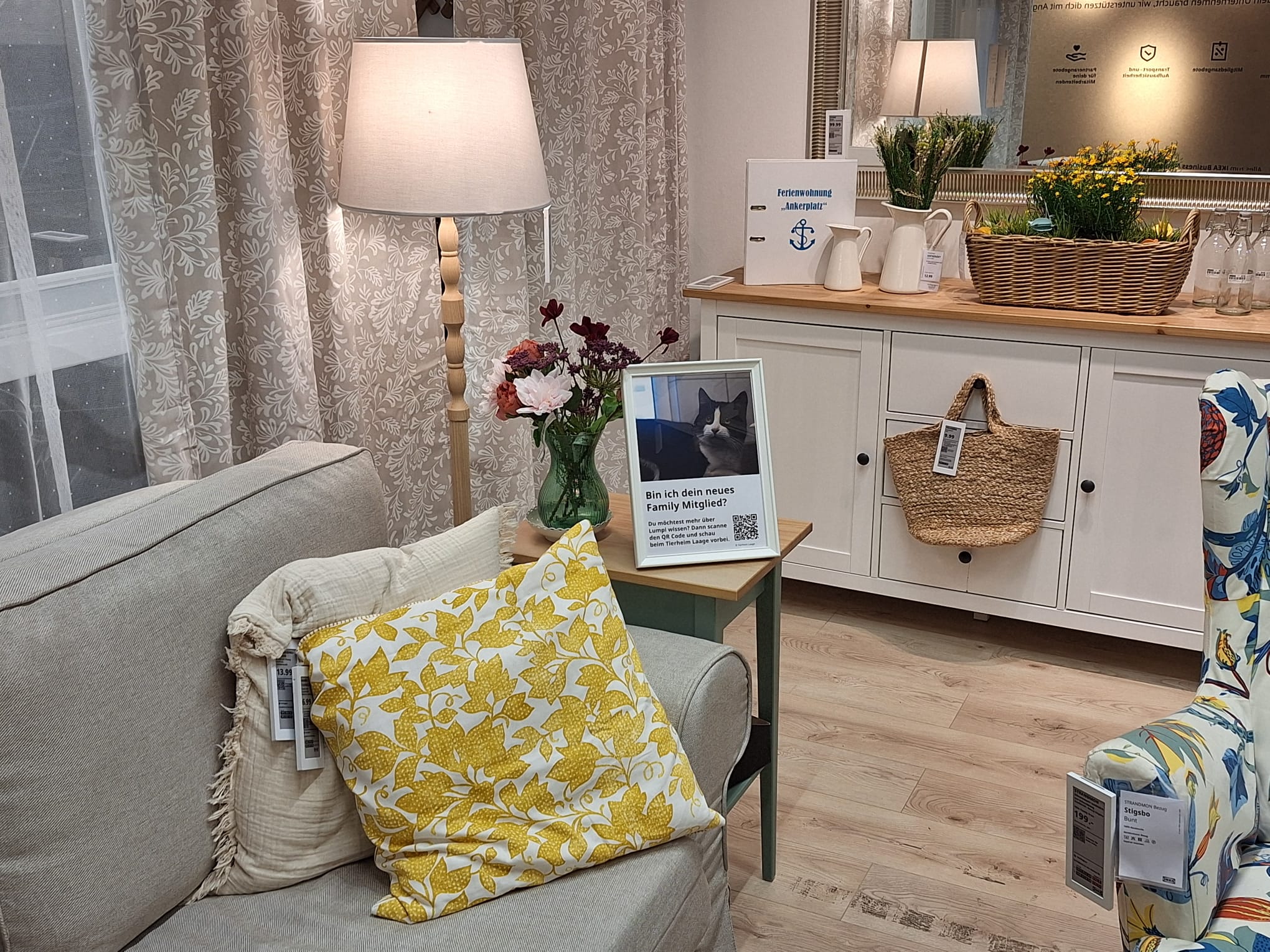 Seit Februar 2026 stehen nun unsere Schützlinge und auch einige ehemalige Bewohner mitten in der Möbelausstellung bei IKEA Rostock. Zwischen liebevoll eingerichteten Wohnräumen, Küchen und Schlafzimmern blicken euch nun Tiere entgegen, die selbst noch auf der Suche nach genau so einem Zuhause sind.
